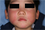 りんご病という言葉はなんどか耳にした方が多いと思います。ほっぺが赤くなりりんごのようなので親しみをこめてそう言われます。伝染性紅斑が正式な病名です。原因はヒトパルボウイルスB19でくしゃみなどの飛沫によって感染する冬から春にかけて流行することが多い病気です。多くは児童がかかる病気ですが、たまに、親や保母さんがかかることもあります。潜伏期は約2週間で、顔に特に両頬に平手打ちされたような紅い斑点が鼻柱で連なり蝶のような形として生じてきます。最初はさわると少し盛り上がりを感じる斑点なのですが、時間とともに融合して平らな斑点となります。口の周りは赤くならないのが特徴です。顔の発疹は7日から14日で消えていきます。顔以外にも二の腕の伸側に爪位の大きさの紅い斑点が生じ、3.4日で前腕から次第に手の甲におよびます。4-5日で消えて末端に移動していくのです。頭は症状がでませんが太ももや体には生じることもよくあります。これらの発疹は地図状から網目レース状になります。最後は湿疹のように粉を吹くこともなく、色素沈着も残さず発疹が生じてから2週間位できれいに治ります。ただ、怒ったり啼きわめいたりの精神的興奮や気温上昇・入浴・日光などで再燃することがあります。